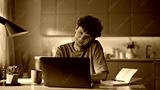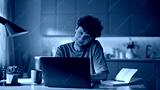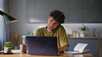 Closeup laughing freelancer calling mobile phone texting laptop at remote office