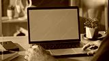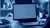 Unrecognizable businessman watching greenscreen laptop on office desk closeup