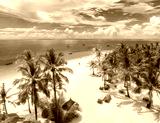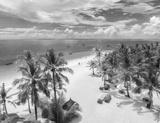 Aerial view of white sandy beach with palm trees, sunbeds, umbrellas, yachts, boats, blue ocean, sky with clouds at sunset. Summer in Kendwa, Zanzibar island. Tropical landscape. Clear sea. Top view