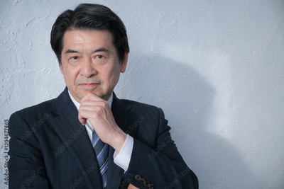 シニアビジネスマンの顎に手を当てる真剣な表情のカメラ目線 グレーバッグ