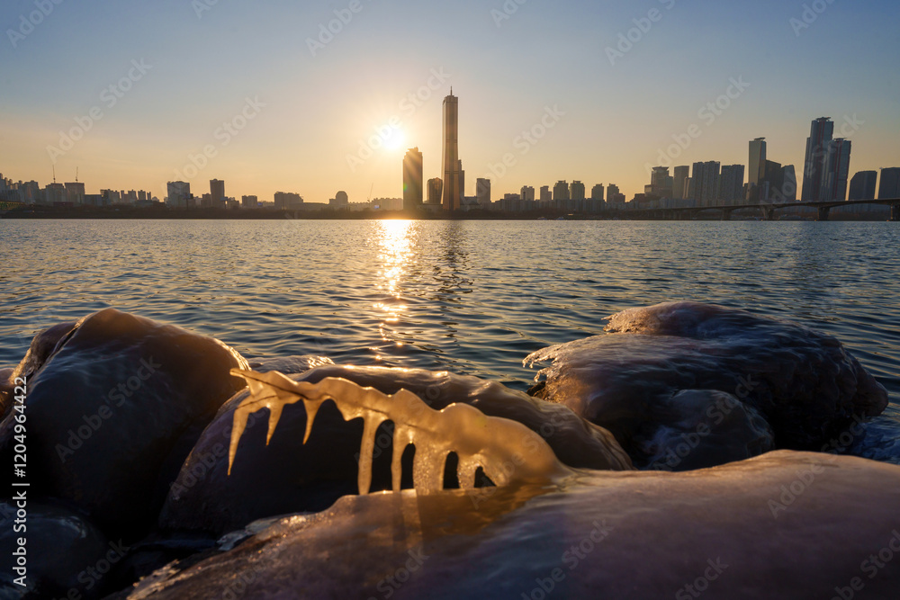 Sunset at seoul city and Downtown skyline in Seoul, South Korea.