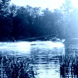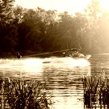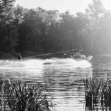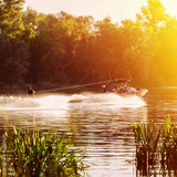 boat pulls man water skiing on the river. Sunset. Splashes of water.