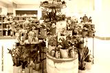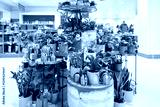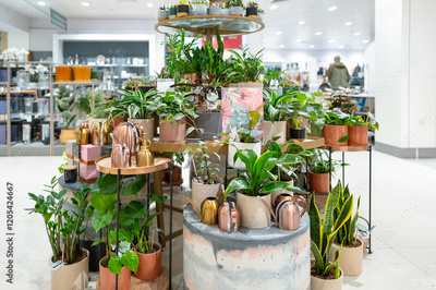 Large selection of deciduous houseplants seen for sale in a large, British department store. The background shows other home furnishing shelves.