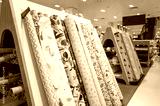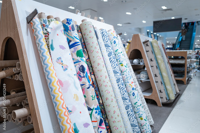 Large selection of generic wallpapers and fabrics seen for sale in a well known British department store. Customer escalators can be seen in the background.
