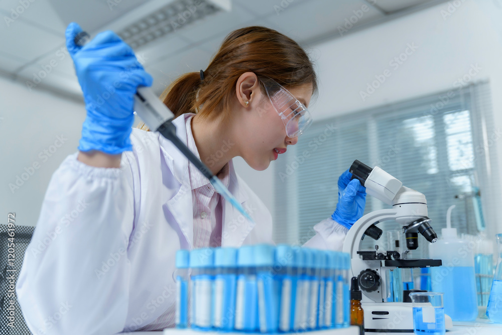 Scientist in lab coat using micropipette and microscope during medical research