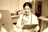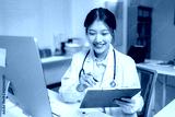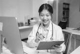 Young female physician smiling and working with computer and taking notes on clipboard in her bright modern office