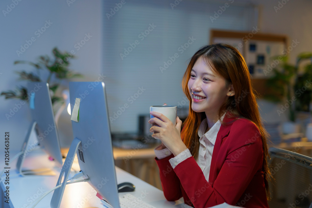 Asian businesswoman working late at night and drinking coffee, smiling and looking at computer