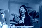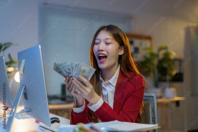 Excited businesswoman holding and looking at cash money in office at night, celebrating successful investment