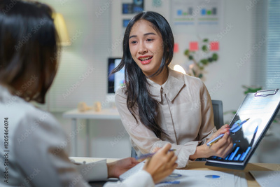 Asian businesswomen are analyzing financial charts and graphs in office meeting