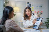 Asian businesswomen presenting financial charts and graphs using clipboard during a meeting in the office at night