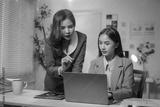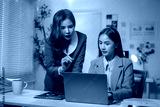 Two Asian businesswomen analyzing financial charts displayed on laptop screen, working together in office at night