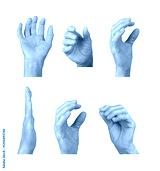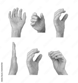 Elderly woman's hand in various gestures, including pinching, grasping, and holding, wrinkled skin and expressive movement, body language conveying action. Isolated on white background.
