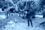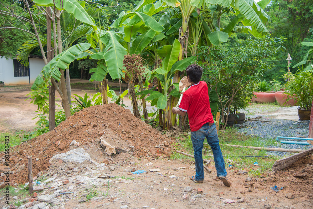 Worker working digs a hole with a shovel in the sand at construction site,Shoveling worker digging