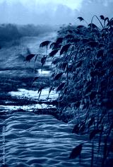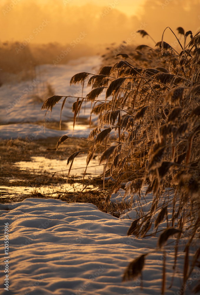 Zimowy, mroźny poranek nad stawem, przymrozek.