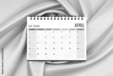 April 2025 desk calendar on pink color silk textile background, Flat lay.