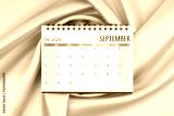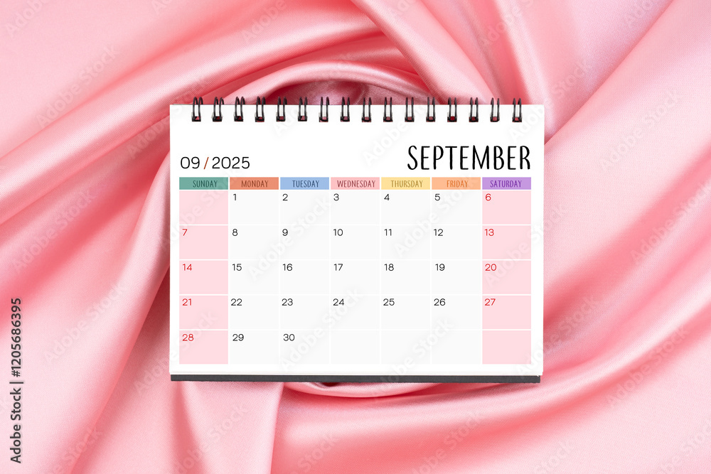 September 2025 desk calendar on pink color silk textile background, Flat lay.