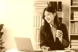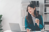 Young Asian woman digital nomad in office using laptop watching training video. Text message with customer, financial accounting concept