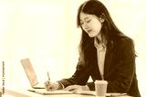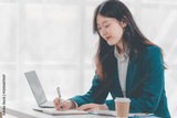 Young Asian woman digital nomad in office using laptop watching training video. Text message with customer, financial accounting concept