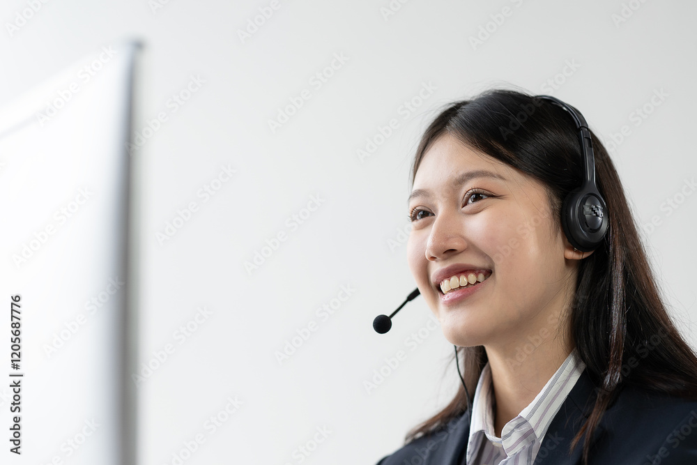 Smiling Asian woman wearing headset working in call center giving customer service consultation