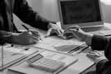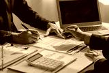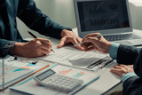 A meeting to review organizational compliance with experts reviewing documents. Investment advisor, strategy, planning, accounting concepts Business advisory group meets to analyze finances
