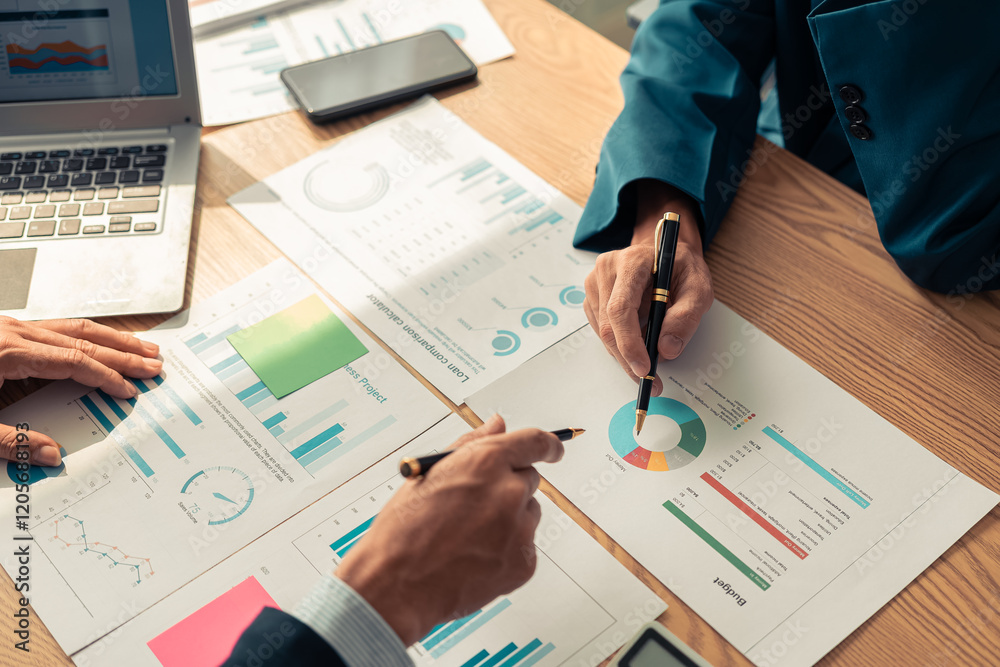 A meeting to review organizational compliance with experts reviewing documents. Investment advisor, strategy, planning, accounting concepts Business advisory group meets to analyze finances