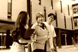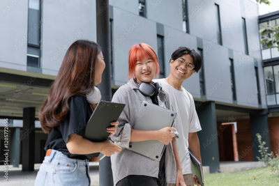 Group of cheerful students chatting together while walking outside the university campus