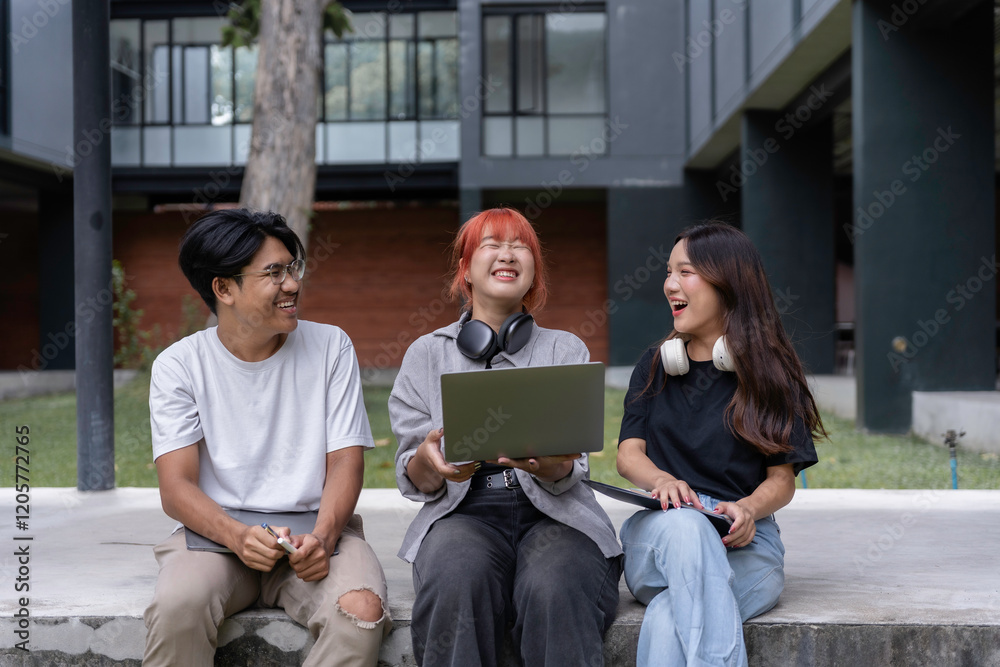 Three cheerful asian students using laptop and digital tablet, sitting and talking outside university campus building