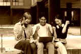 Group of young asian students celebrating success while looking at a laptop computer outdoors