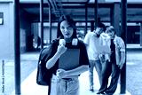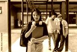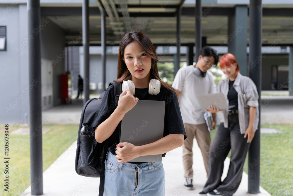 Portrait of a smiling asian female student holding a laptop with her classmates collaborating on a project in the background at university campus