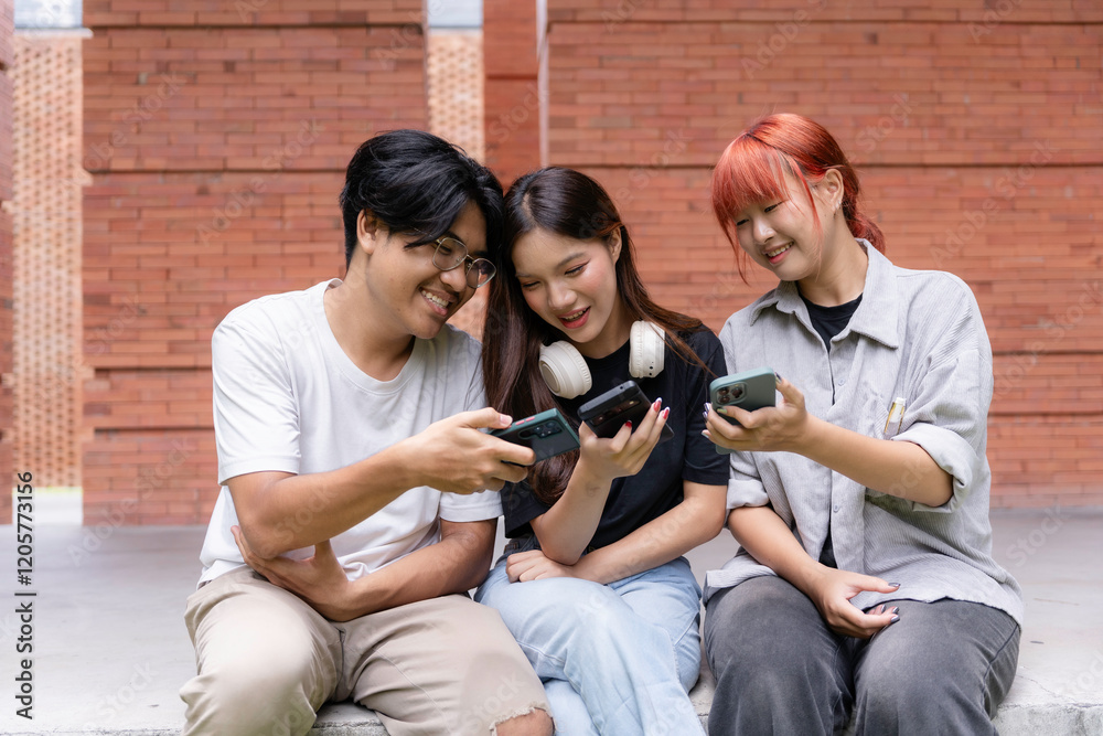 Three happy asian students sharing online content using mobile phones sitting on a bench outside university campus