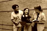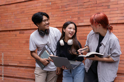 Three cheerful students collaborating on a project, sharing ideas and laughing together against a brick wall