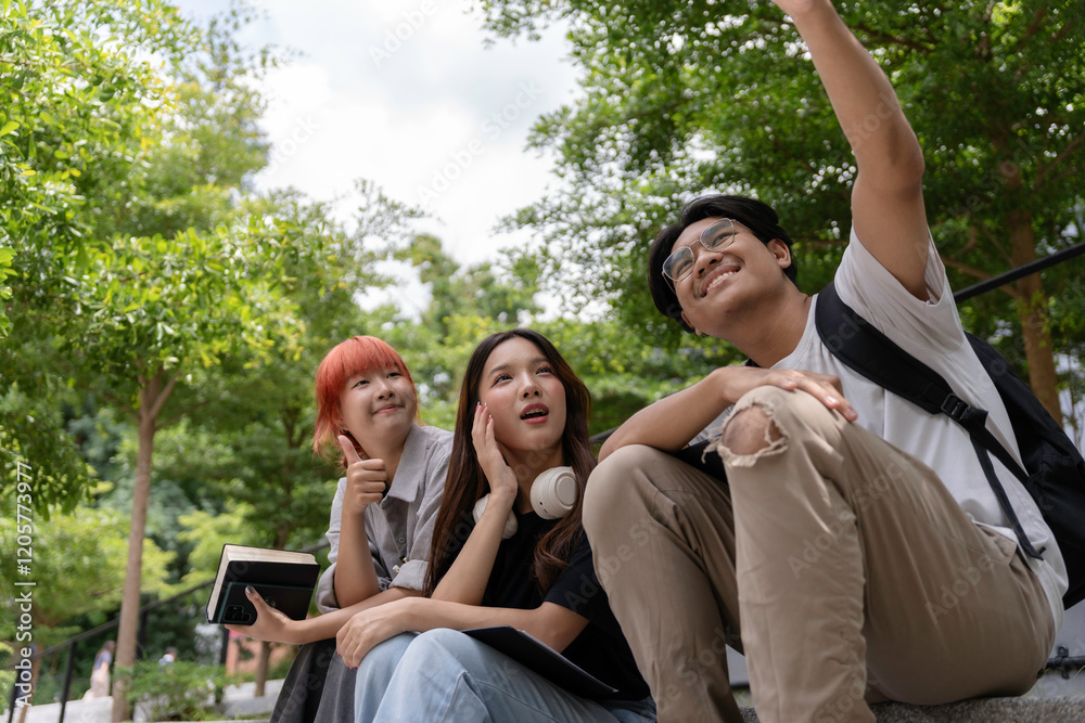 Three asian students taking a selfie sitting on stairs in a park, enjoying their free time
