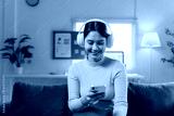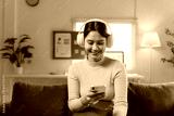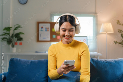 Asian female freelancer enjoying music and using mobile phone while sitting on comfortable sofa in living room