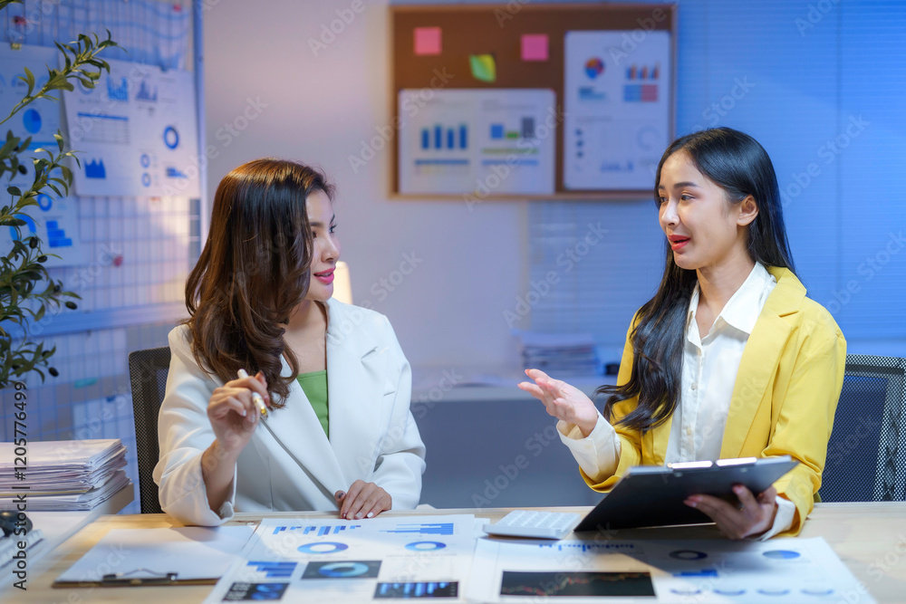 Two Asian businesswomen discussing marketing strategy and analyzing charts of sales reports in the office at night