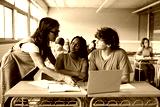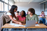 Young male teacher helping female student in class. The tutor helping his students by explaining the lesson and solving doubts. High quality photo