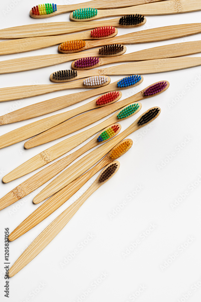 Top view of eco friendly bamboo toothbrushes on grey white, Natural organic personal accessories for tooth care, zero waste, no plastic concept, minimal style aesthetic pattern, colored toothbrush