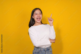 Excited young woman pointing finger up having an idea while looking away on yellow background