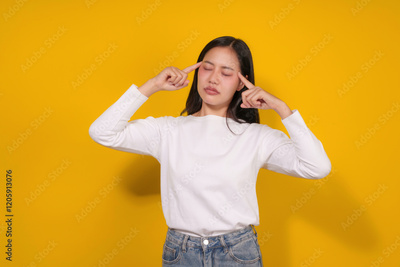Young woman suffering from strong headache massaging temples with closed eyes, standing on yellow background