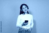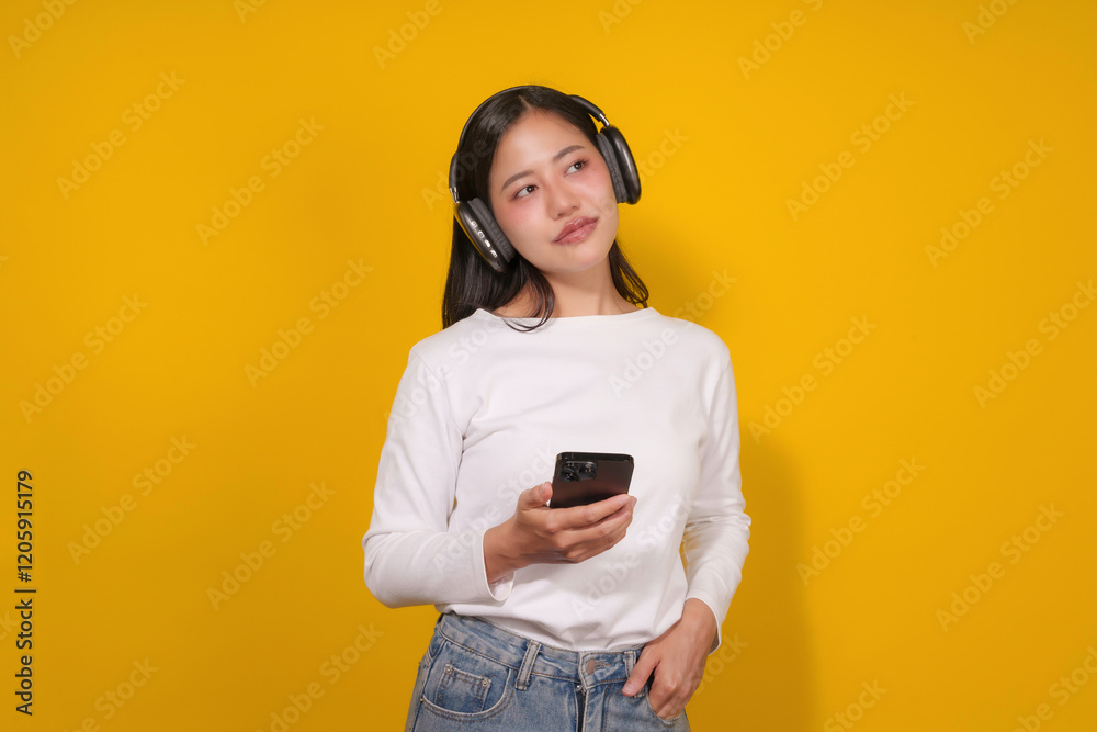 Young woman listening to music with headphones and holding smartphone looking away on yellow background