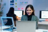 Young professional woman using computer and smiling while working late in office