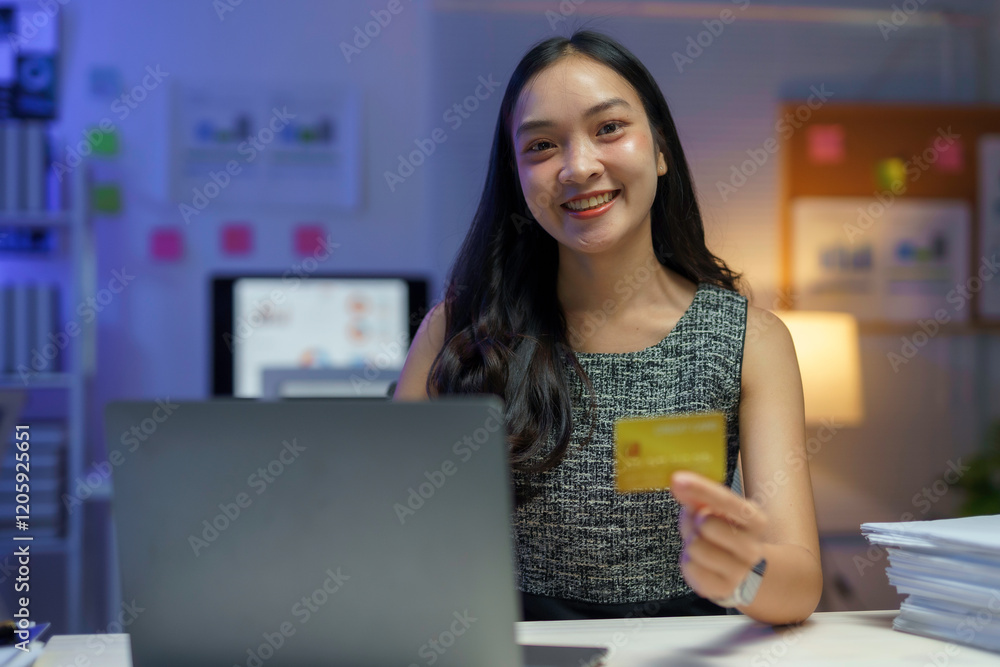 Asian businesswoman using laptop and holding credit card making online payment in office at night