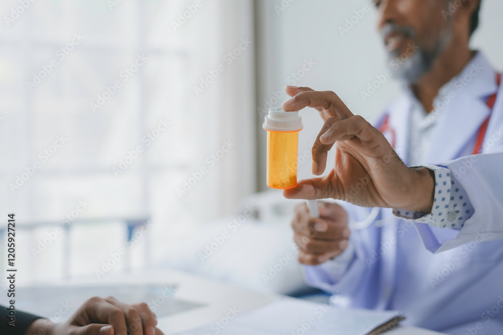 Doctor holding a medicine bottle while explaining prescription to patient in medical office