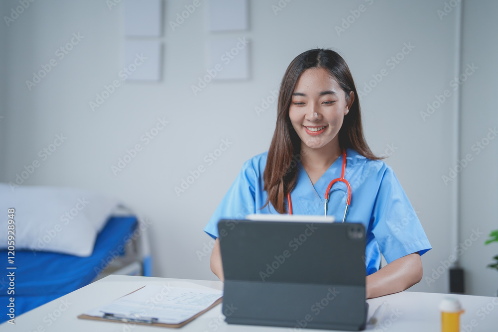 Young female doctor using tablet in hospital room, working with electronic health record and smiling