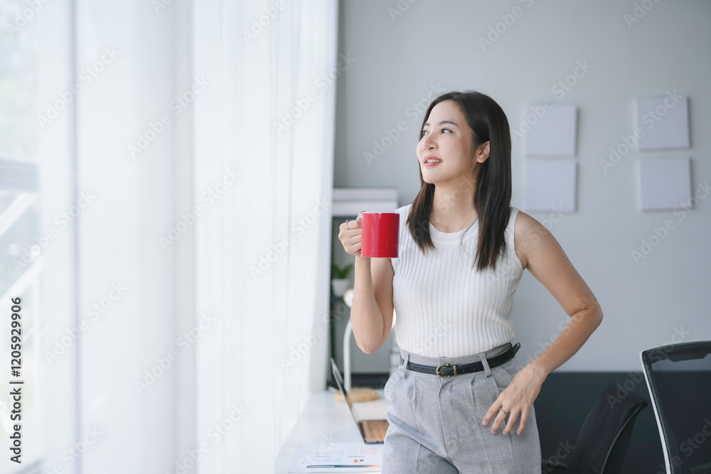 Young Asian businesswoman drinking coffee and looking out the window while standing in modern office