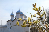 Fluffy blossoming buds of willow branches and orthodox church dome. Spring rustic landscape. symbol of Palm Sunday, religion holiday. arrival of early spring season, awakening of nature concept