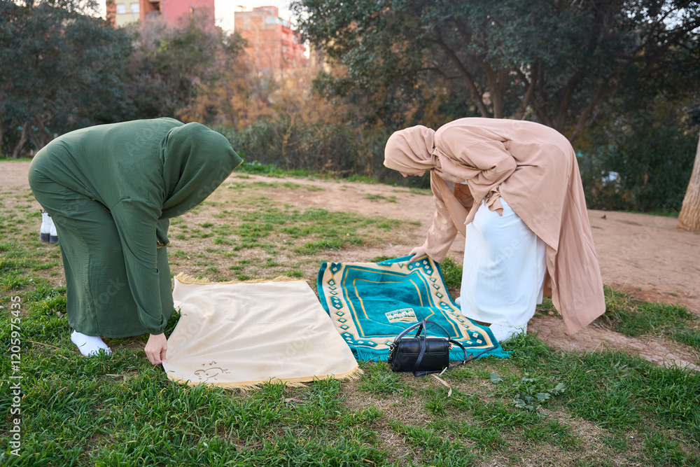 Muslim women preparing prayer rugs in park