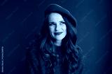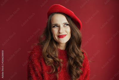 happy woman in sweater and beret against background