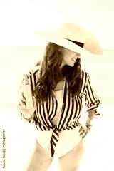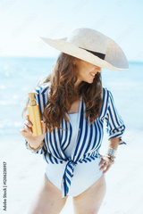 happy elegant female on ocean shore with sunscreen