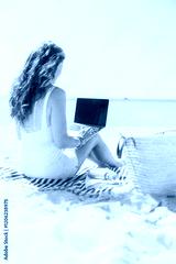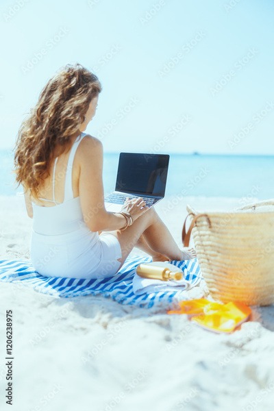 Seen from behind modern woman on seacoast with straw bag