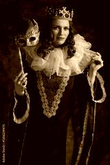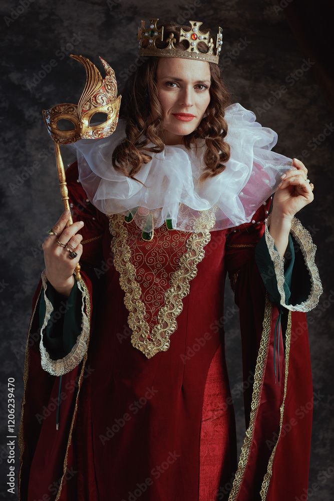 medieval queen in red dress with venetian mask